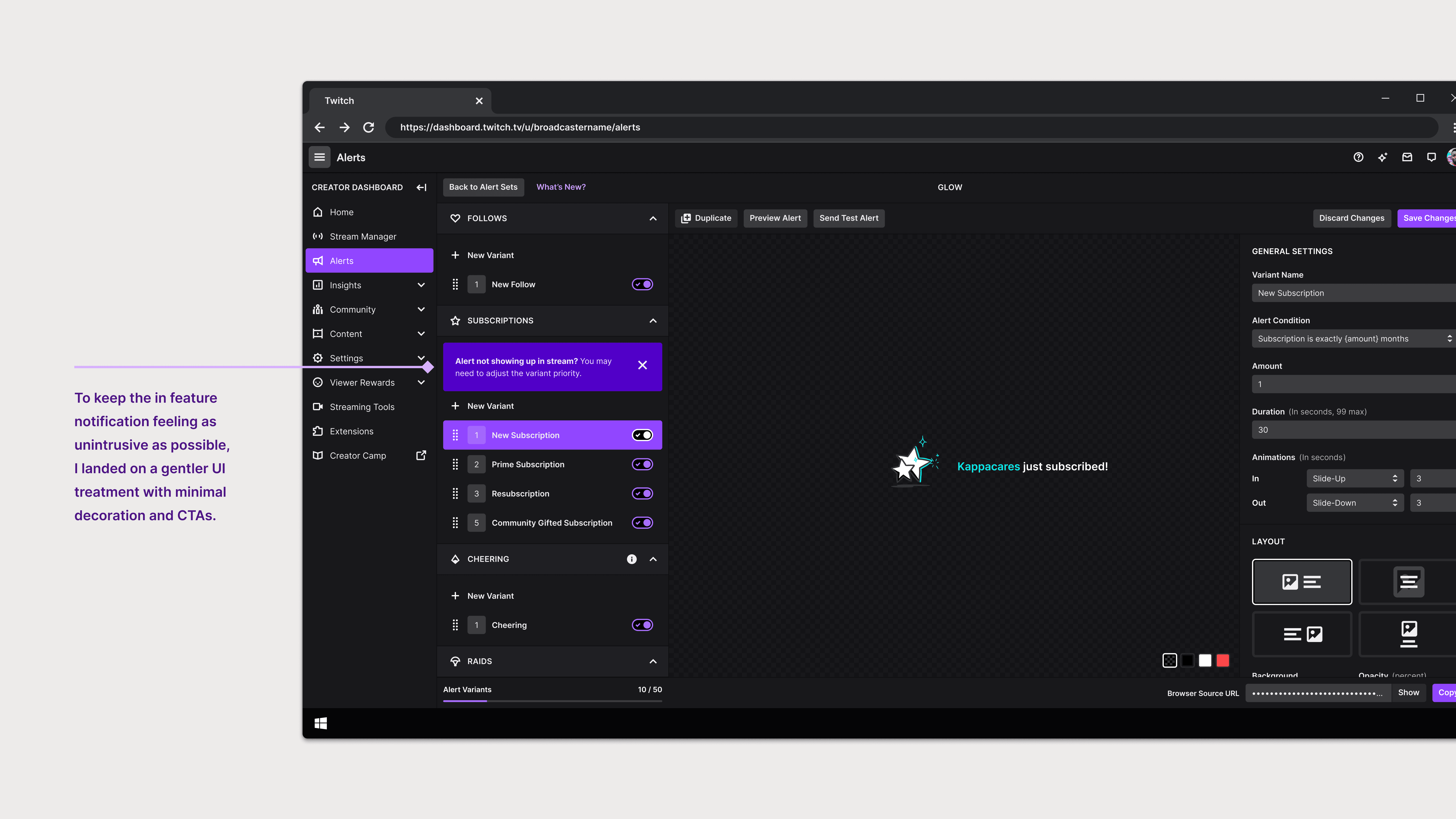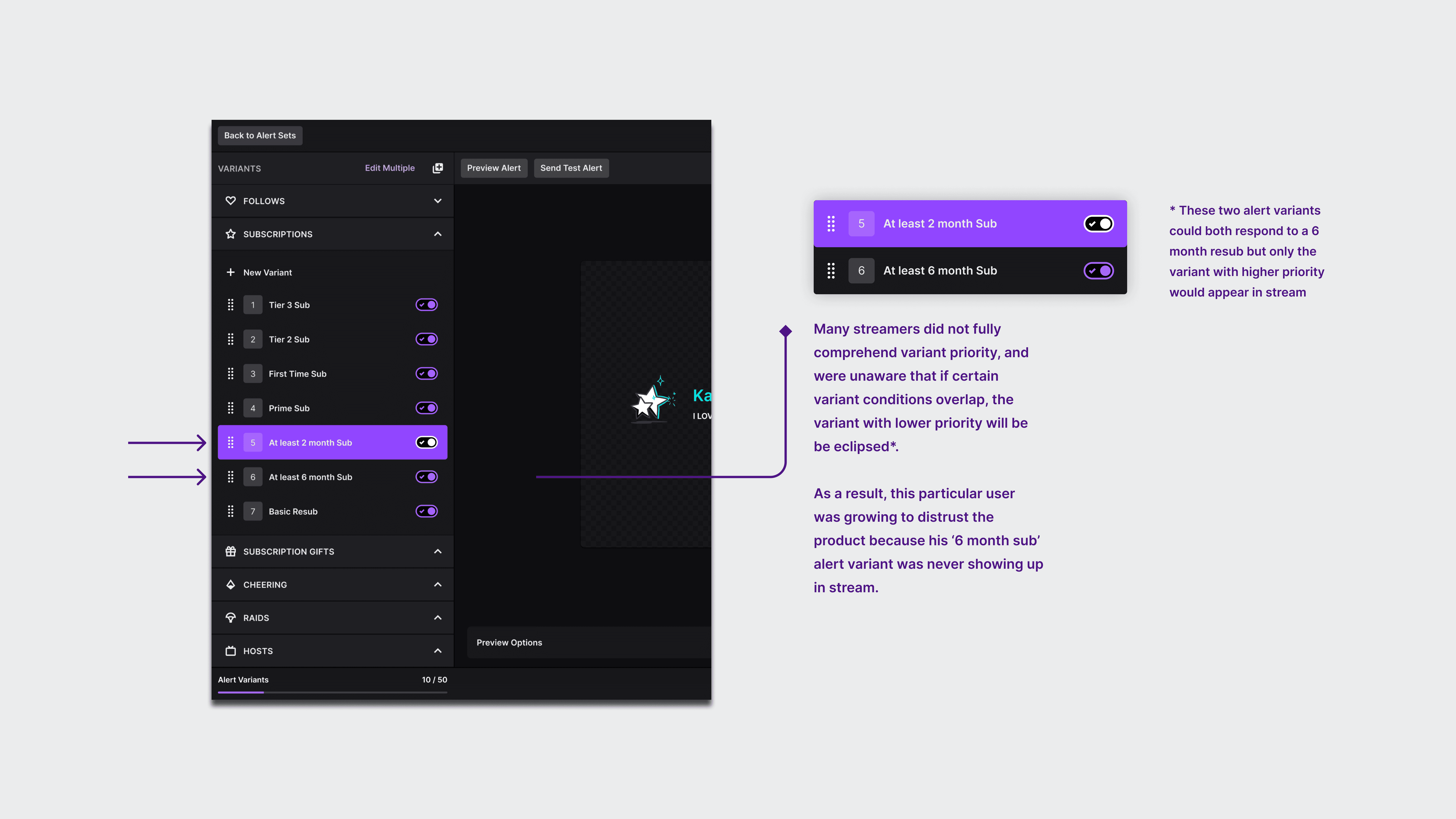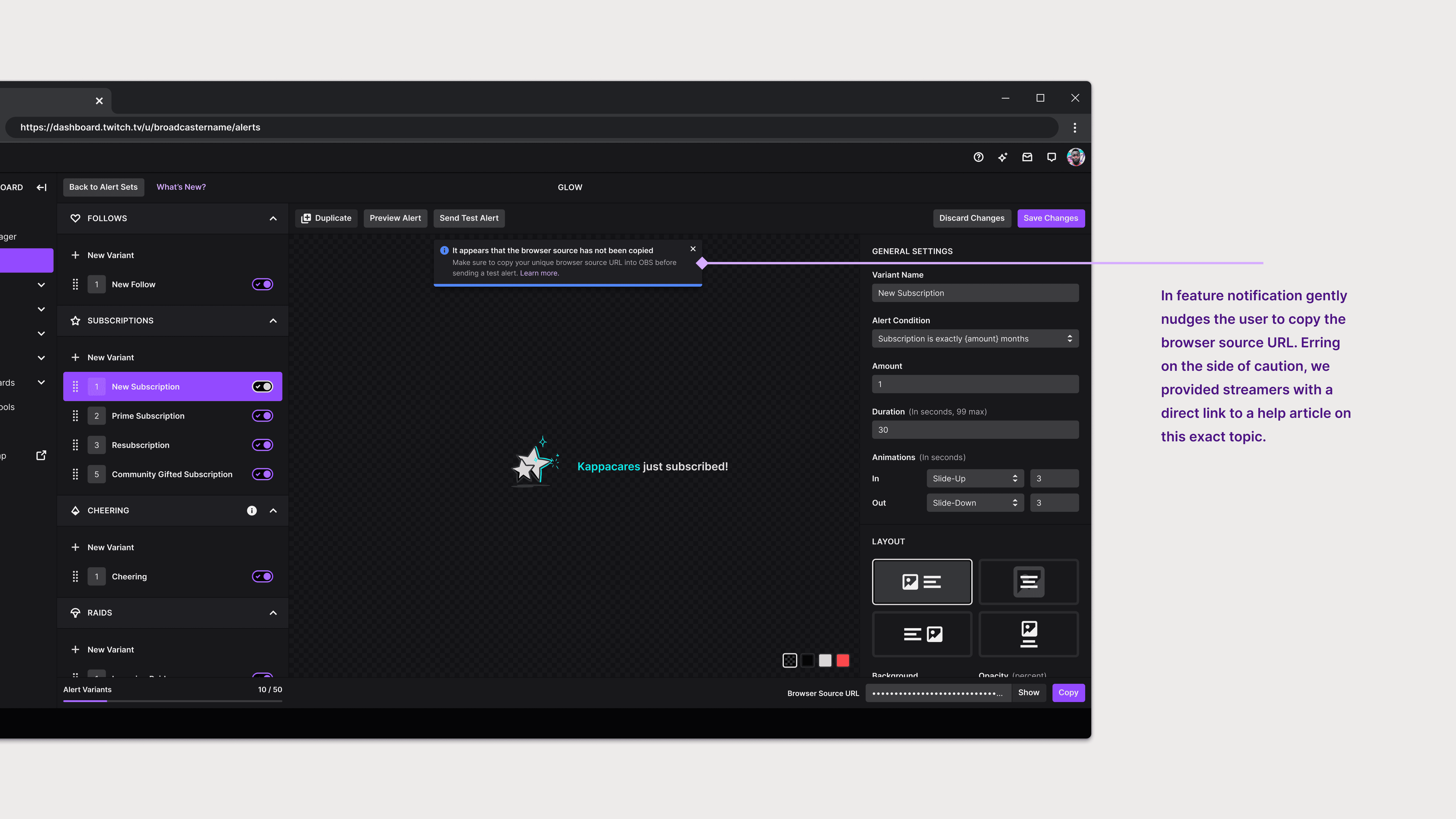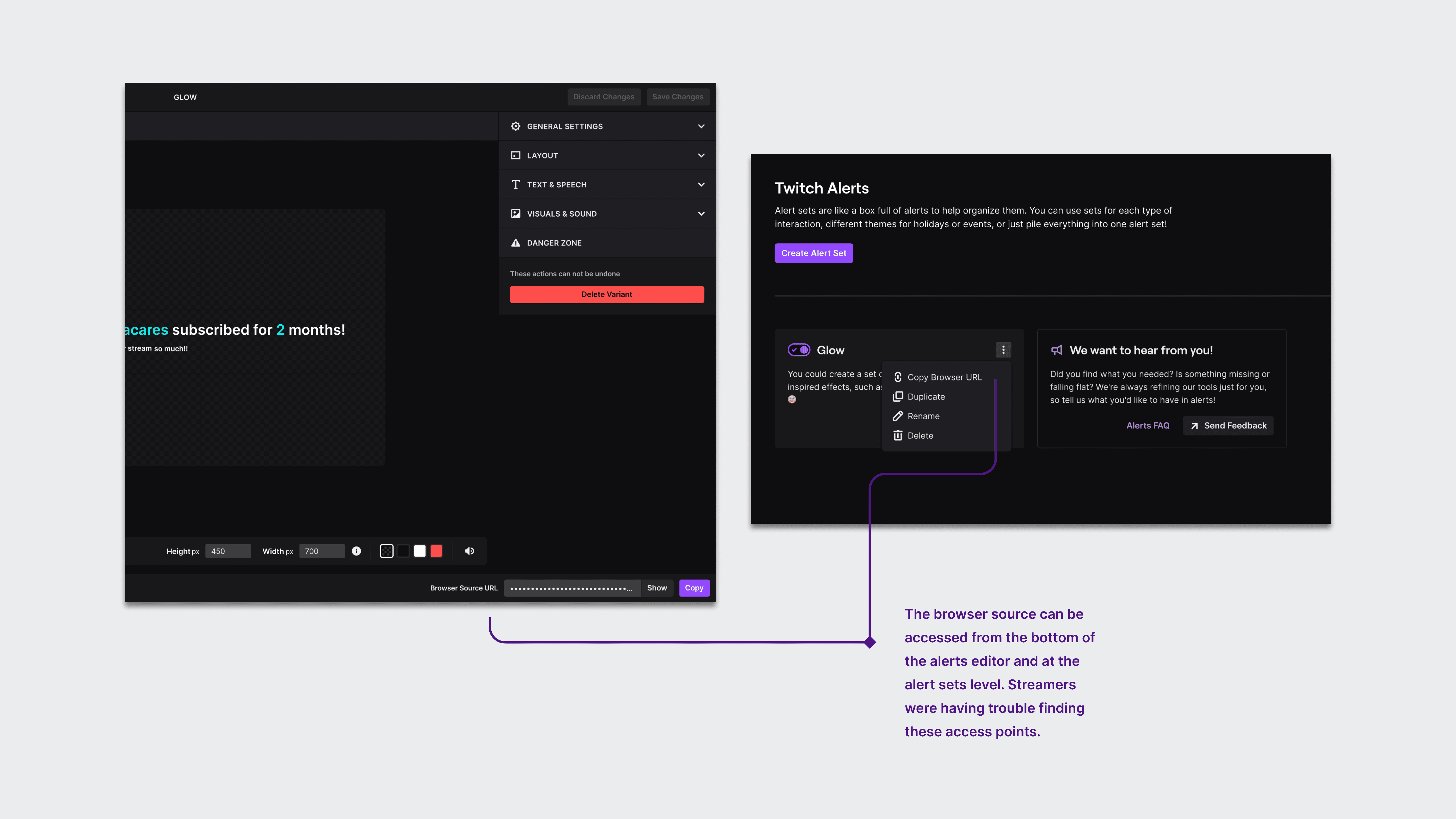 Consulting our user research revealed that the placement and functionality of the browser source, along with variant priority, were clouding the editor experience, both of which are critical steps for streamers to create alerts.
