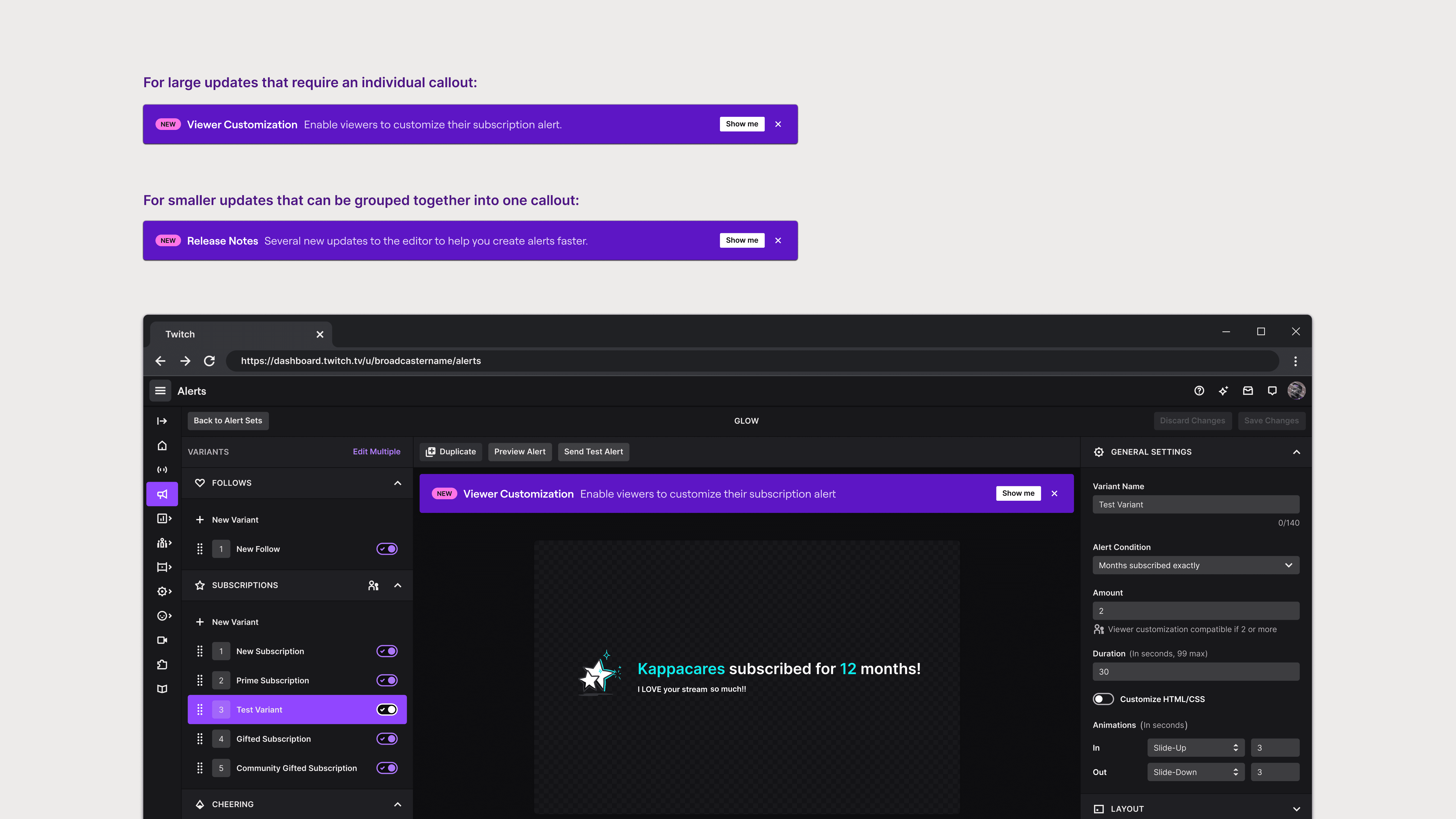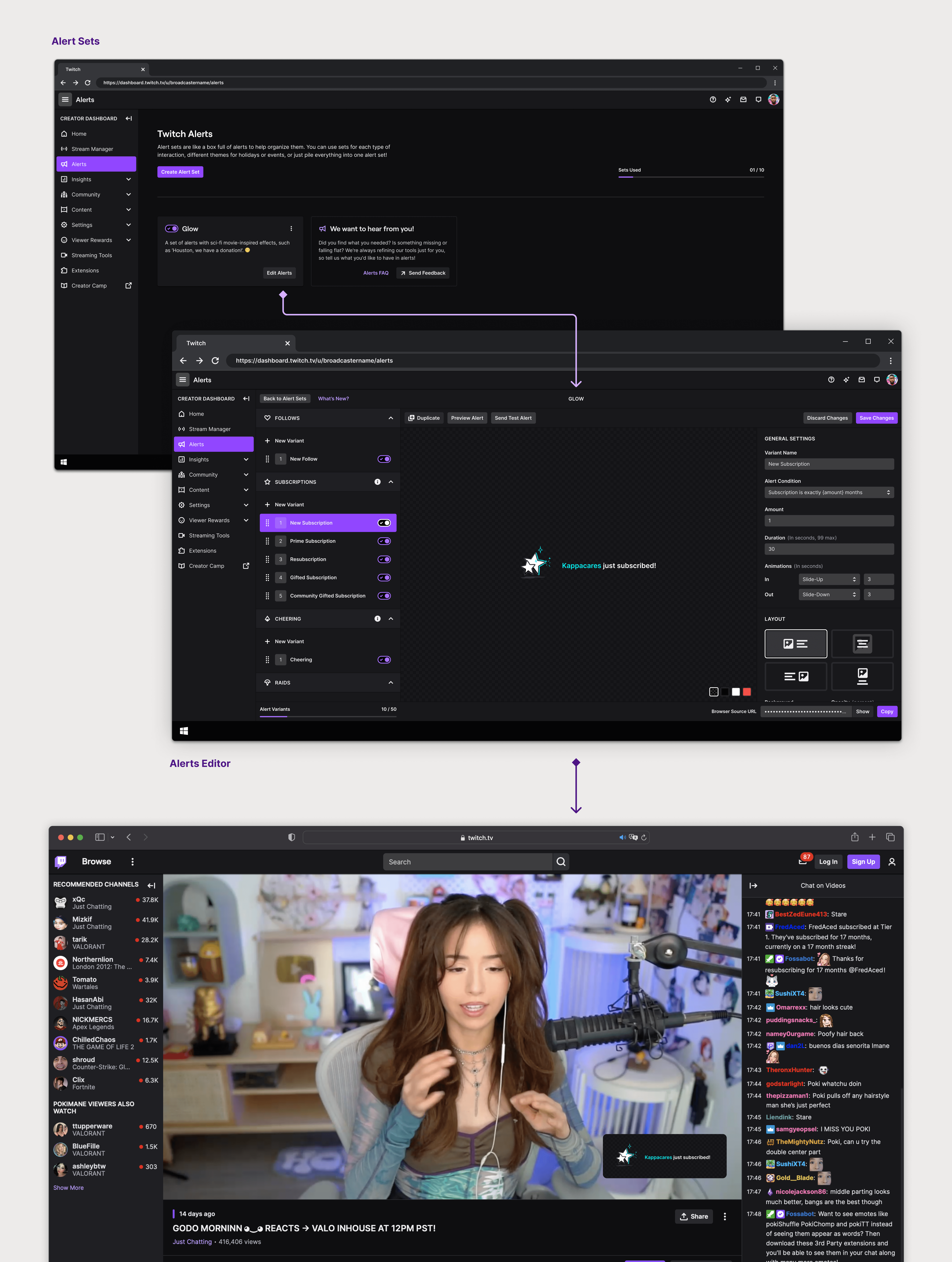 Previously, streamers relied on third-party platforms to create their alerts. But recently Twitch launched first-party alerts allowing streamers to create their alerts in-house. This is a very young product. I designed experiences that would help streamers understand the alerts editor, educated seasoned streamers on the unique advantages of creating in-house alerts, and welcomed new streamers with a supportive introduction to the platform.