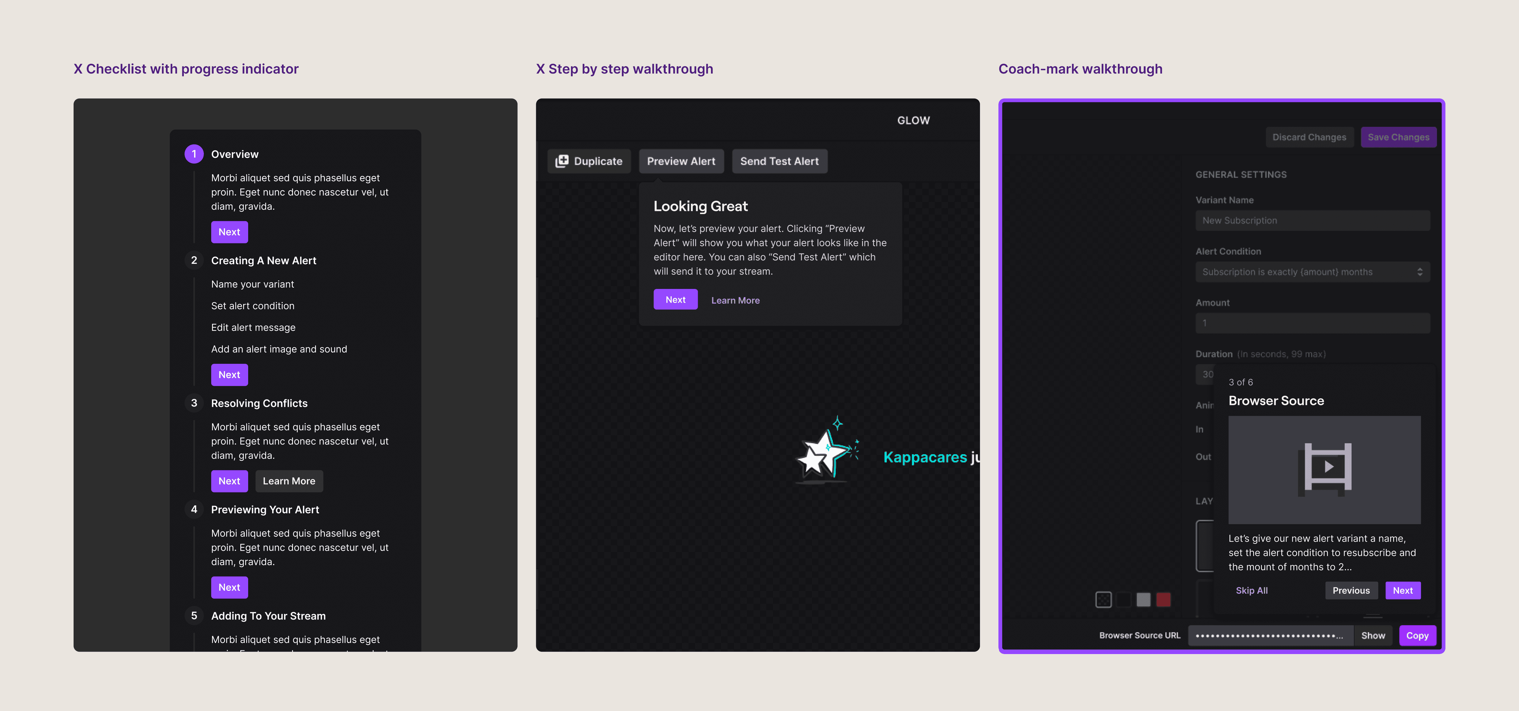 The metaphor that I used to help guide my design decisions is that learning how to create an alert is like getting a key that opens up a door to professional streaming. But — once you have that key — you never need another one again. Instead of just explaining what alerts are in a short blurb (because we know noone reads), I tried to find ways to bake the concierge into the experience.