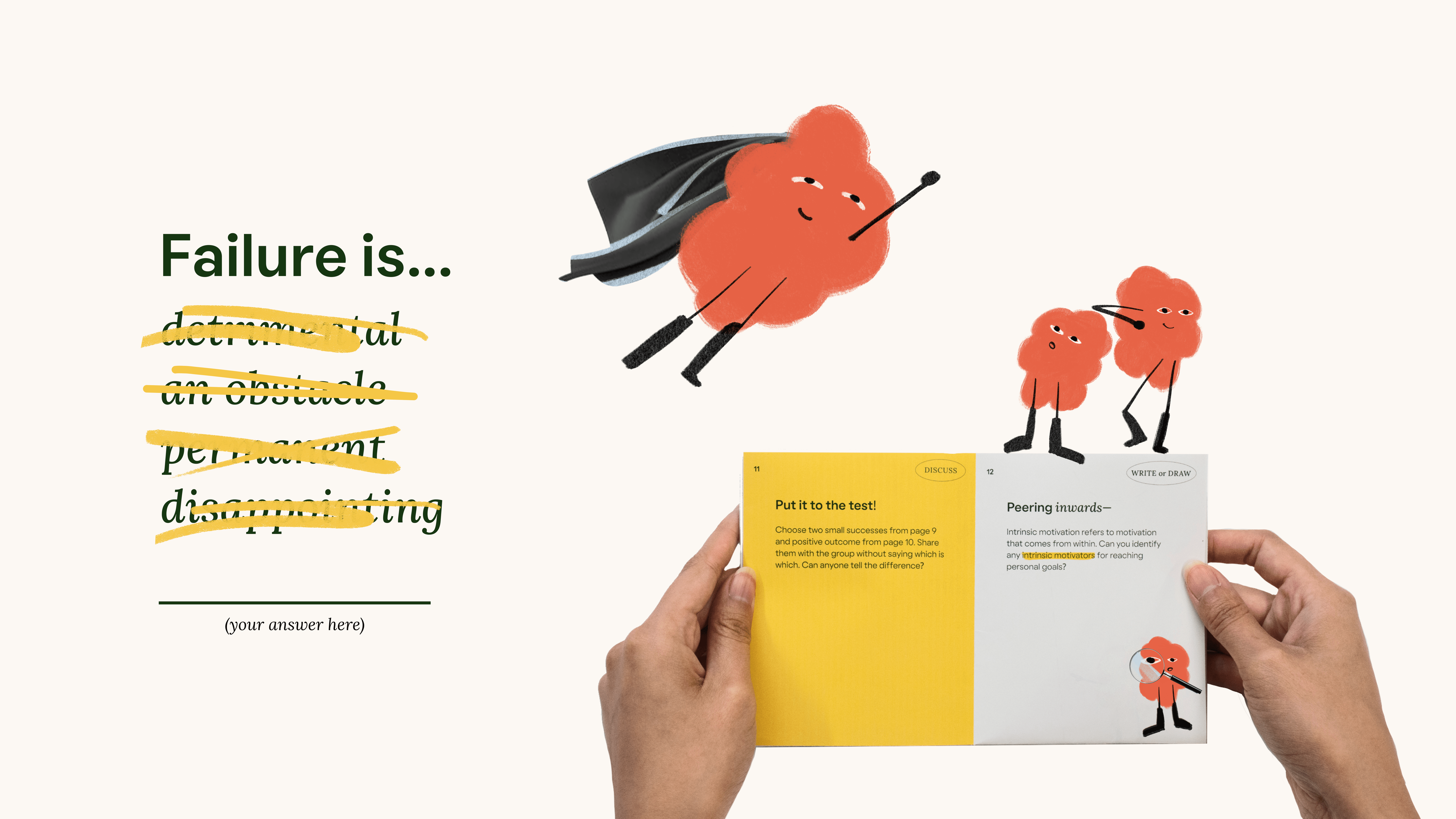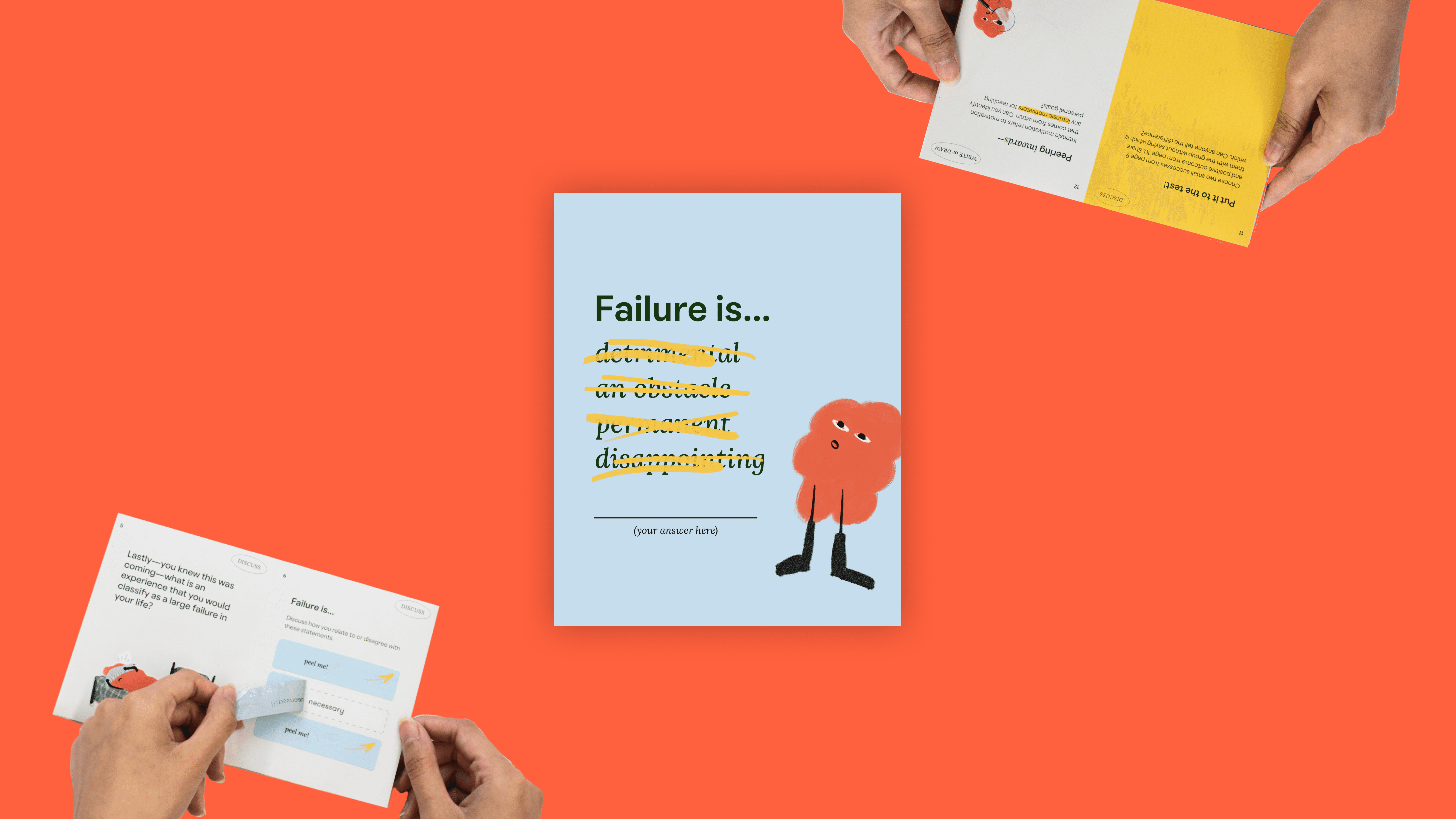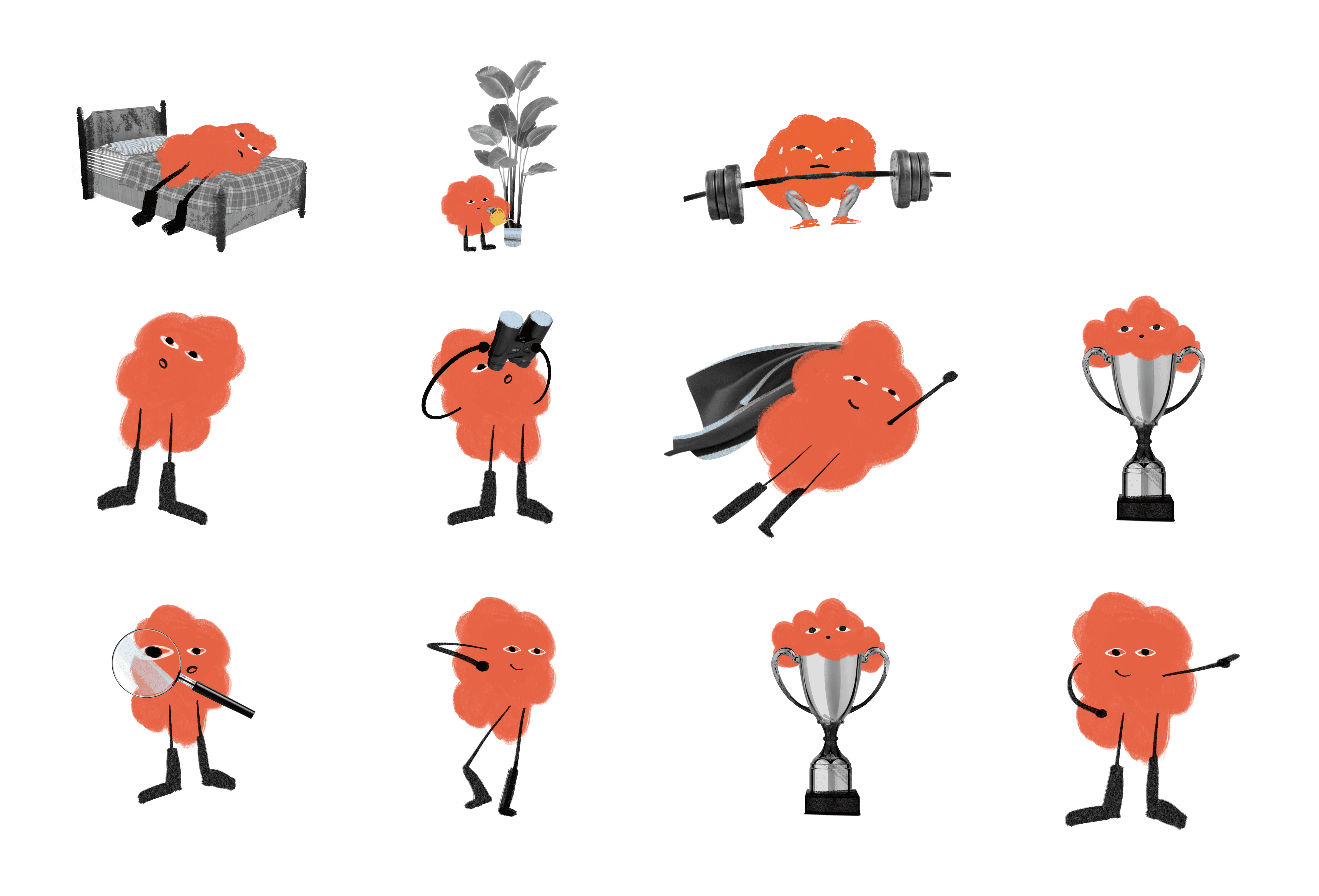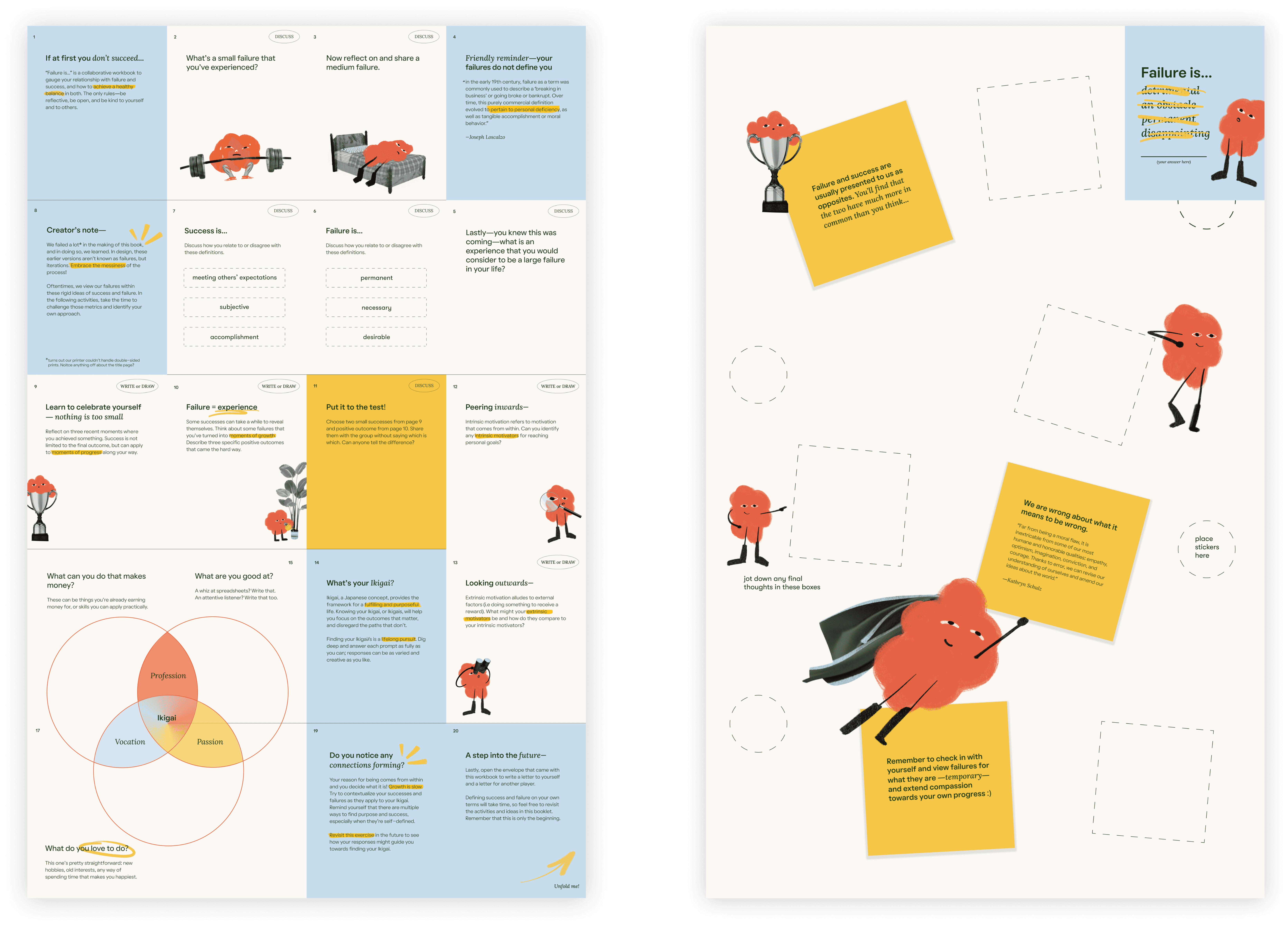 The illustration style is fun but also grown up. It has a handmade feel and it’s expressive enough to convey human feelings and a lightheartedness. The illustrations act as little touches of joy throughout the workbook, to keep things feeling fresh. The character is designed to grow organically with context and environment - maintaining its consistency.